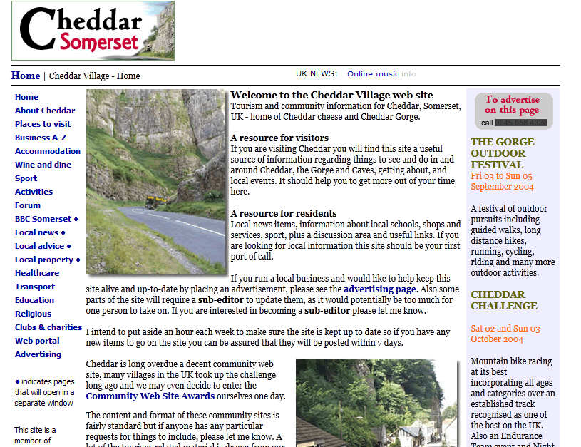 Martin points out that whilst the parish council has a web site, it only covers the routine business of the council and the Parish Clerk would not have the time or resources to run a web portal of the type that cheddarvillage has become. He notes “Cheddar is an internationally known name yet surprisingly many people - particularly from overseas - discover the site, not previously being aware of the associations between the village, the gorge, and the cheese. I believe cheddarvillage was one of the country’s earliest examples of what have now become known as “hyperlocal web sites” - that is, sites with a narrow geographical focus that cover the interests of its residents and visitors.
